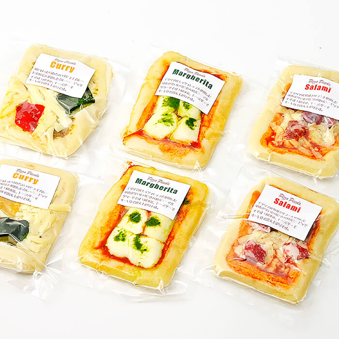 内容量 | ピッツァピッコラマルゲリータ:2枚(1枚約65g)、ピッツァピッコラサラミ&チーズ:2枚(1枚約60g)、ピッツァピッコラドライカレー:2枚(1枚約60g) |