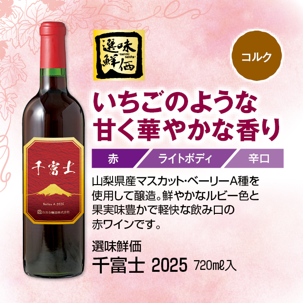 山梨県産マスカット・ベーリーA種を使用して醸造。鮮やかなルビー色と果実味豊かで軽快な飲み口の赤ワインです。