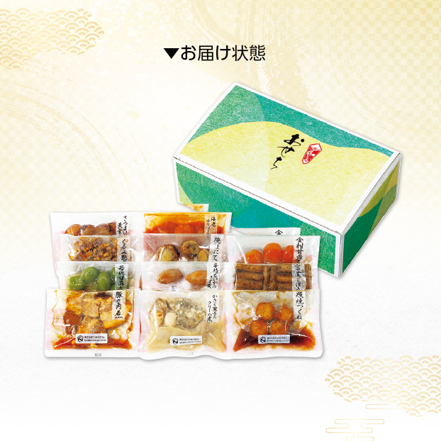 重箱はついていません。写真は盛り付け例となります。重箱やお皿などの容器を準備し盛り付けてください。常温でのお届けとなります。