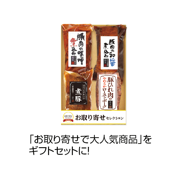 | 内容量 | 豚肉の味噌煮込み210g×1、ほろっとやわらか煮豚230g×1、豚肉の和醤煮込み210g×1、豚ひれ肉のやわらかローストポーク100g×1 |