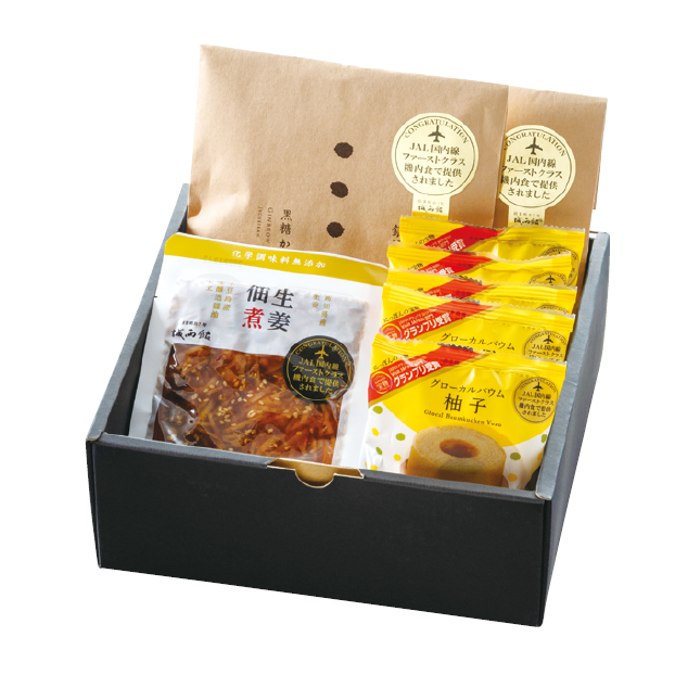 | 内容量 | 銀不老かりんとう54g入×2、グローカルバウム柚子×5、生姜佃煮パック100g(固形45g)×1 |
