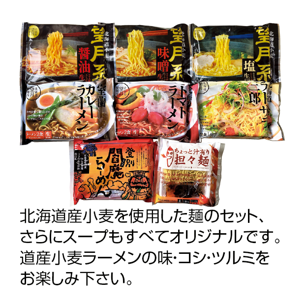 | 内容量 | 望月系 醤油ラーメン(120g×2・スープ付)、望月系 味噌ラーメン(120g×2・スープ付)、望月系 塩ラーメン(120g×2・スープ付)、のぼりべつ閻魔ラーメン(120g×2・スープ付)、室蘭カレーラーメン(120g×2・スープ付)、 シシリアンルージュのトマトラーメン(120g×2・スープ付)、ラーサラ三郎(120g×2・スープ付)、 ちょっと汁有り担々麺(130g・スープ付) |
