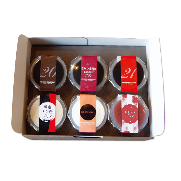 | 内容量 | 20世紀プリン、21世紀プリン、あまおうプリン、とみつ金時のしあわせプリン、黒蜜きな粉プリン、蒜山ジャージー乳のパンナコッタ×各1 |