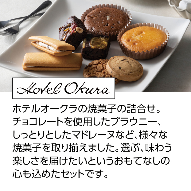 ホテルオークラの焼菓子の詰合せ。チョコレートを使用したブラウニー、しっとりとしたマドレーヌなど、様々な焼菓子を取り揃えました。選ぶ、味わう楽しさを届けたいというおもてなしの心も込めたセットです。