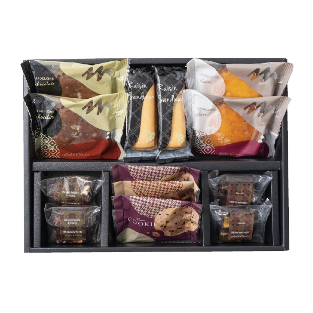 | 内容量 | ブラウニー(ネーブル、ドライフルーツ&ナッツ)、レーズンサンド、マドレーヌ(プレーン・チョコ)、レーズンクッキー×各2コ、チョコチップクッキー×1コ |