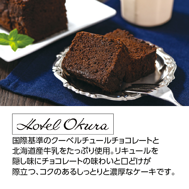 国際基準のクーベルチュールチョコレートと北海道産牛乳をたっぷり使用。リキュールを隠し味にチョコレートの味わいと口どけが際立つ、コクのあるしっとりと濃厚なケーキです。