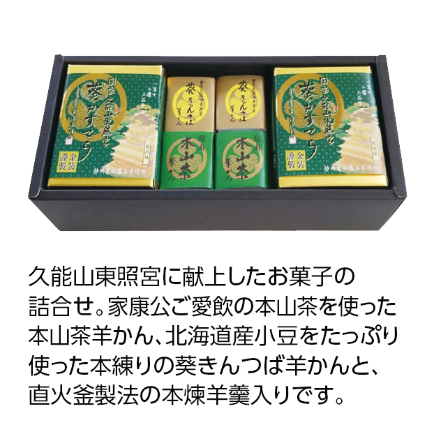 | 内容量 | 葵カステラ85g×2コ、本山茶羊かん38g×4コ、葵きんつば羊かん38g×4コ |