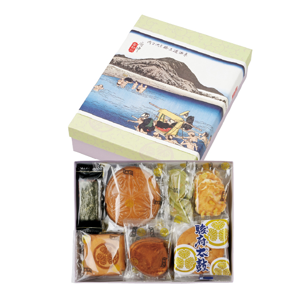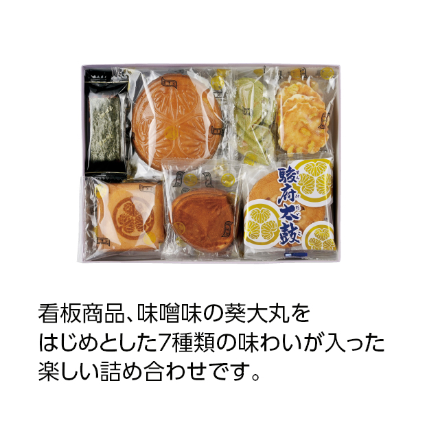 看板商品、味噌味の葵大丸をはじめとした7種類の味わいが入った楽しい詰め合わせです。