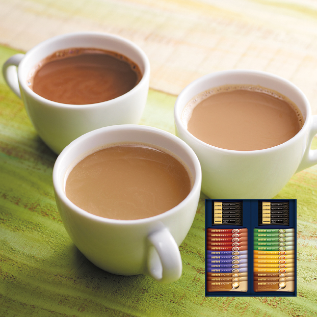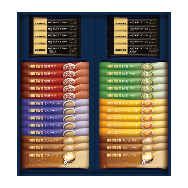 | 内容量 | カフェラテ14g×6、ブラックコーヒー2g×10、(ハニーカフェ・オ・レ14g・黒糖ラテ15g・ミルクティー15g・抹茶・ラテ11g)×各5 |