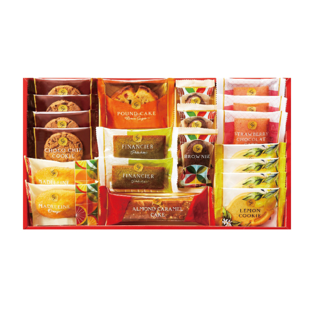 | 内容量 | オレンジマドレーヌ・ピスタチオフィナンシェ各2コ、ブラウニー3コ、ケーキ(ストロベリーショコラ3コ、ブラウンシュガーパウンド・アーモンドキャラメル各1コ)、クッキー(チョコチップ・レモン各4コ) |