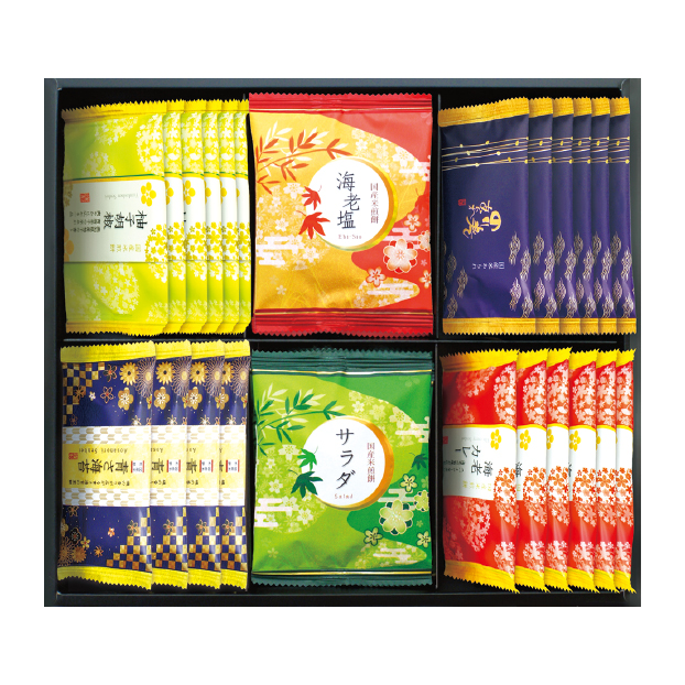 | 内容量 | のり巻あられ×6枚、柚子胡椒煎餅×6枚、海老カレー煎餅×6枚、あおさ海苔煎餅×4枚、海老塩煎餅×3枚、サラダ煎餅×3枚 |