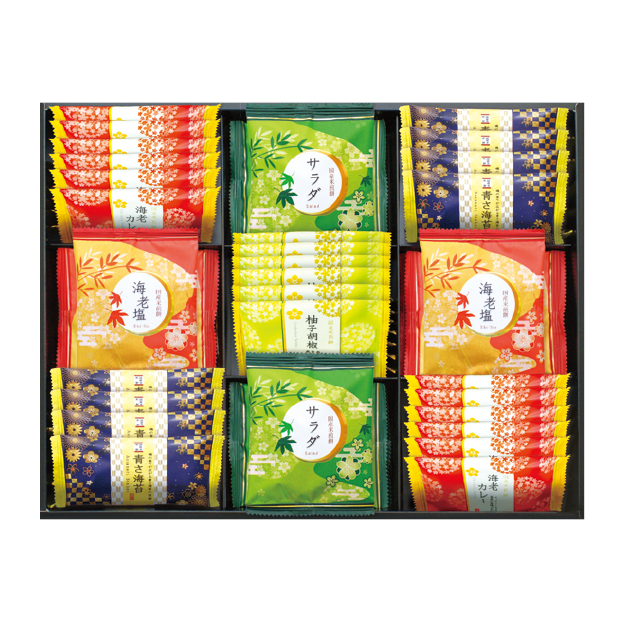 | 内容量 | 海老カレー煎餅×12枚、あおさ海苔煎餅×8枚、海老塩煎餅×6枚、サラダ煎餅×6枚、柚子胡椒煎餅×6枚 |
