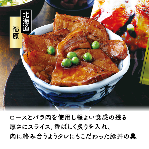 ロースとバラ肉を使用し程よい食感の残る厚さにスライス。香ばしく炙りを入れ、肉に絡み合うようタレにもこだわった豚丼の具。