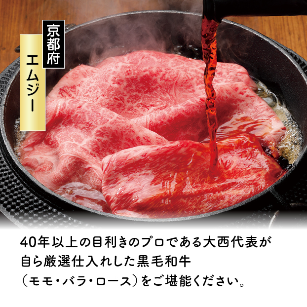 40年以上の目利きのプロである大西代表が自ら厳選仕入れした黒毛和牛(モモ・バラ・ロース)をご堪能ください。