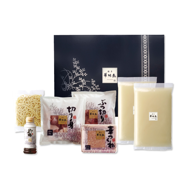 | 内容量 | 水たきスープ600g×2、華味鳥切り身300g、華味鳥ぶつ切り300g、華つくね200g、博多ぽん酢220ml、ちゃんぽん麺150g |
