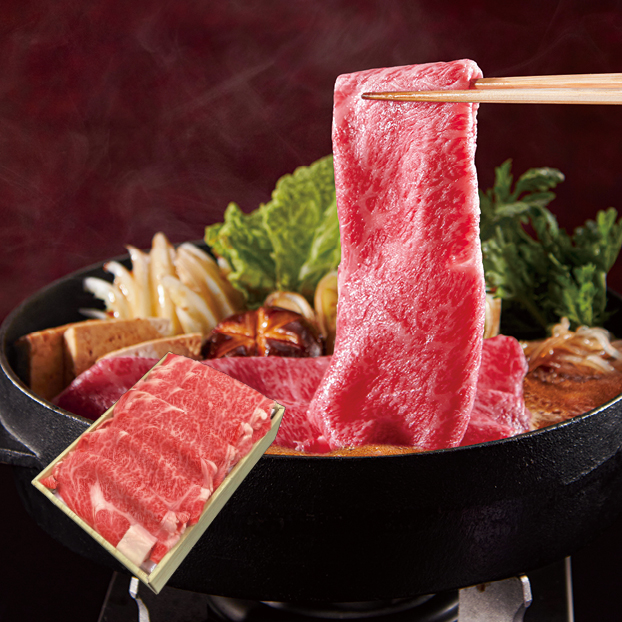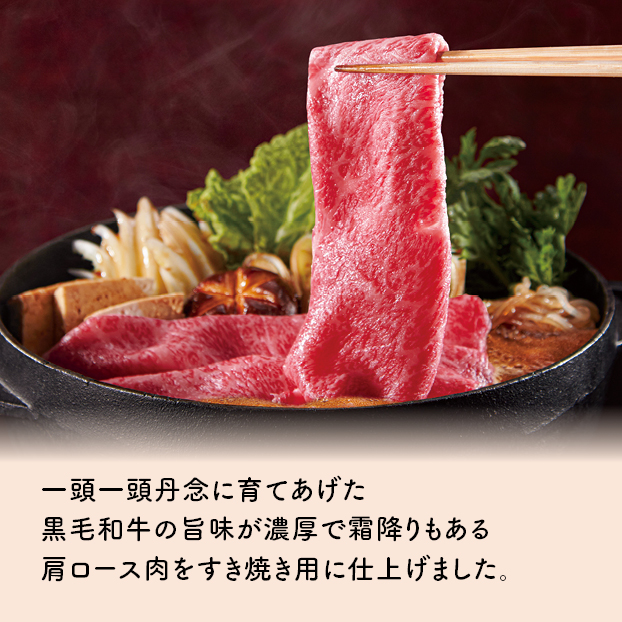 一頭一頭丹念に育てあげた黒毛和牛の旨味が濃厚で霜降りもある肩ロース肉をすき焼き用に仕上げました。