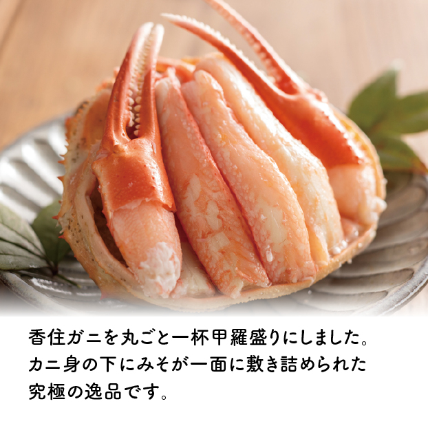 香住ガニを丸ごと一杯甲羅盛りにしました。カニ身の下にみそが一面に敷き詰められた究極の逸品です。