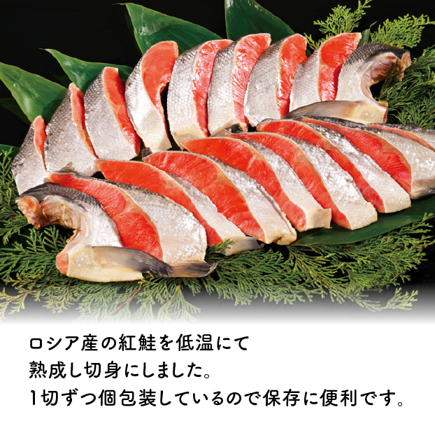 ロシア産の紅鮭を低温にて熟成し切身にしました。1切ずつ個包装しているので保存に便利です。
