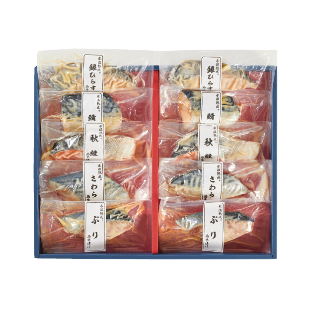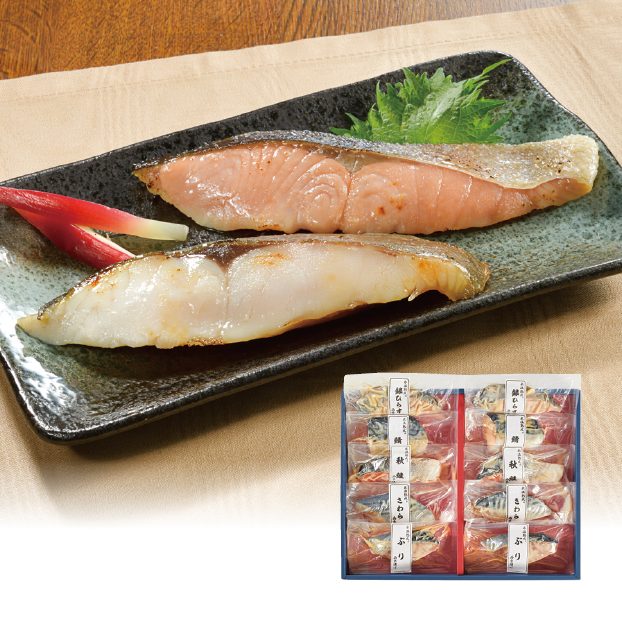 | 内容量 | 銀ひらす(ニュージーランド産)60g×2、鯖(ノルウェー産)60g×2、秋鮭(国産)60g×2、さわら(国産)70g×2、ぶり(国産)70g×2 |