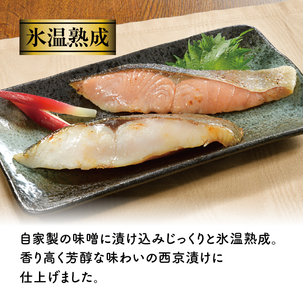 自家製の味噌に漬け込みじっくりと氷温熟成。香り高く芳醇な味わいの西京漬けに仕上げました。