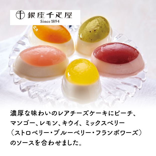 濃厚な味わいのレアチーズケーキにピーチ、マンゴー、レモン、キウイ、 ミックスベリー(ストロベリー・ブルーベリー・フランボワーズ)のソースを合わせました。