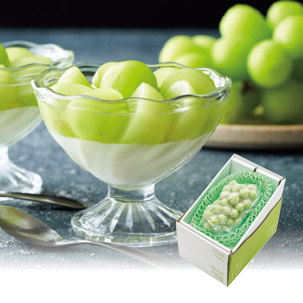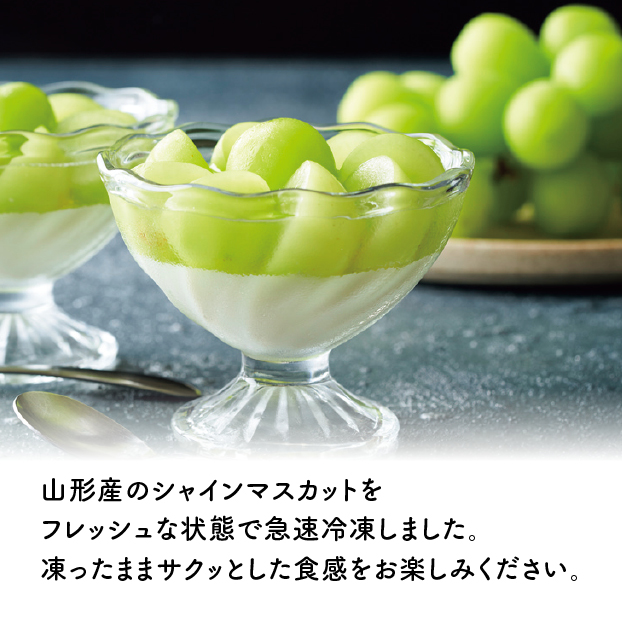 山形産のシャインマスカットをフレッシュな状態で急速冷凍しました。凍ったままサクッとした食感をお楽しみください。
