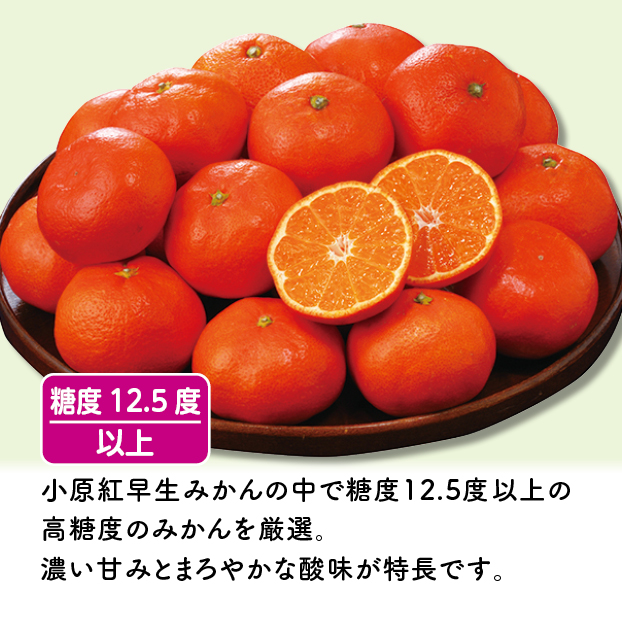 小原紅早生みかんの中で糖度12.5度以上の高糖度のみかんを厳選。濃い甘みとまろやかな酸味が特長です。