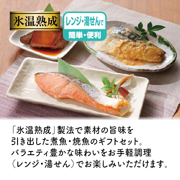 「氷温熟成」製法で素材の旨味を引き出した煮魚・焼魚のギフトセット。バラエティ豊かな味わいをお手軽調理(レンジ・湯せん)でお楽しみいただけます。