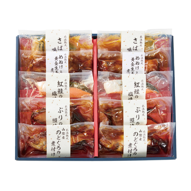 | 内容量 | 紅鮭の塩焼き60g・めぬけと黄金生姜の煮付け100g・ぶりの照り焼き90g・さばの味噌煮90g・のどぐろの煮付け85g×各2 |