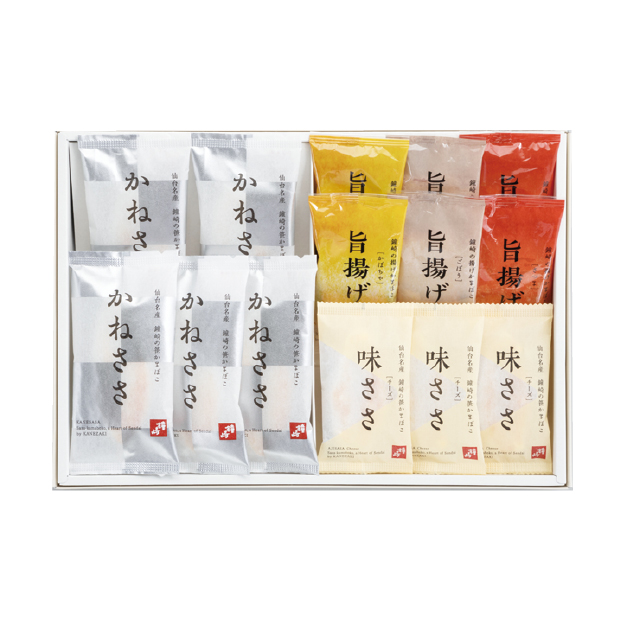 | 内容量 | かねささ×5、味ささ(チーズ)×3、旨揚げ(さつま・ごぼう・かぼちゃ)×各2 |