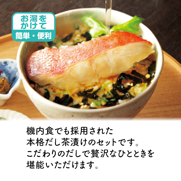 機内食でも採用された本格だし茶漬けのセットです。こだわりのだしで贅沢なひとときを堪能いただけます。
