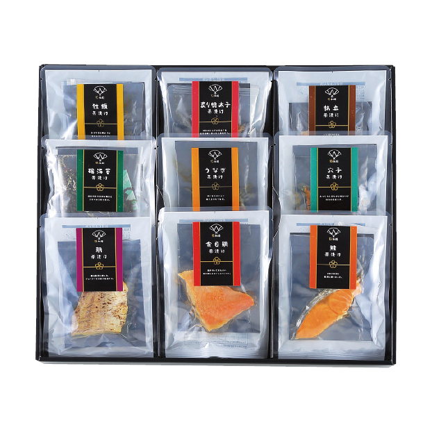 | 内容量 | お茶漬け(金目鯛・穴子・鮭・鯛・帆立・鰻・磯海苔・牡蠣・炙り明太子)×各1、だしつゆ×9、具材×9 |