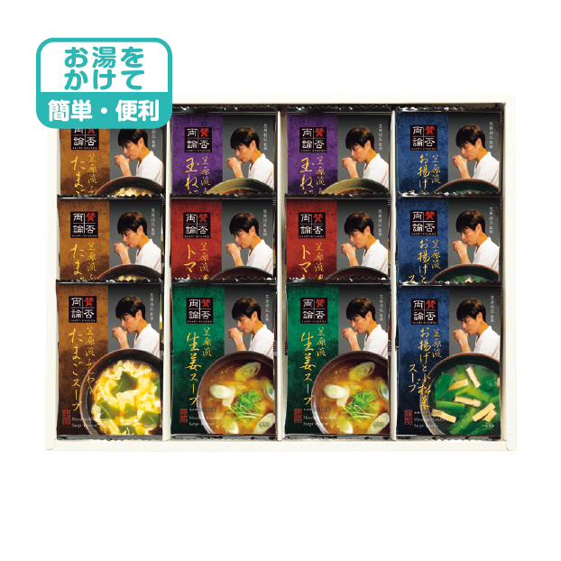 | 内容量 | 濃厚トマトスープ・生姜スープ・あめ色玉ねぎスープ×各2、ふんわりたまごスープ・お揚げと小松菜のスープ×各3 |