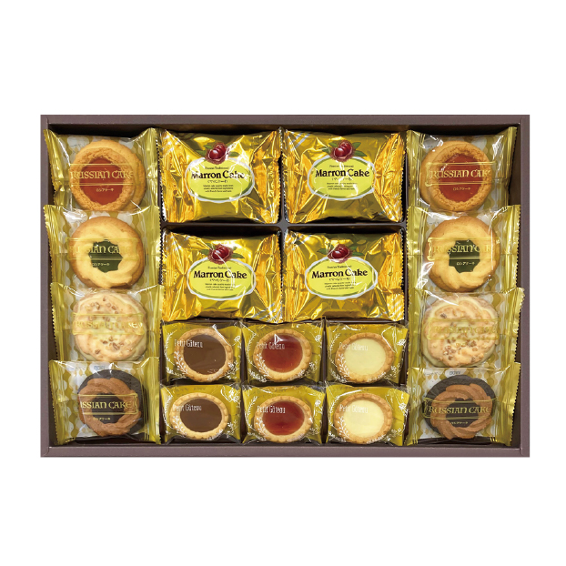 | 内容量 | マロンケーキ×4、プチガトー(ストロベリー・ミルクチョコ・ホワイトチョコ)×各2、ロシアケーキ(マカロンストロベリー・フラワーキウイ・リッチビター・ホワイトチョコ)×各2 |