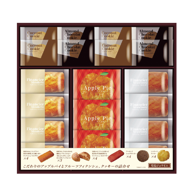 | 内容量 | アップルパイ×3、フルーツフィナンシェ(マンダリン・ストロベリー)×各4、クッキー(アーモンドショコラ・ココナッツ)×各4 |