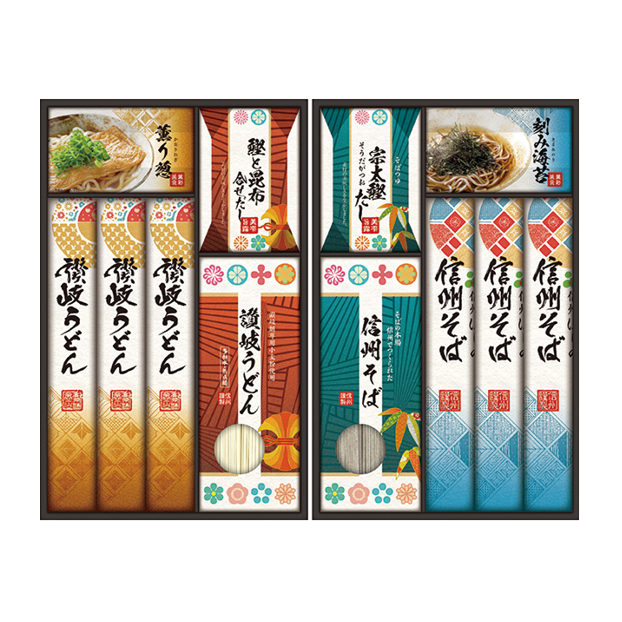| 内容量 | 讃岐うどん180g×3、信州そば160g×3、讃岐うどん240g、信州そば240g、つゆ(うどん・そば)各12ml×各8、刻み海苔3g、薫り葱0.6g×2 |