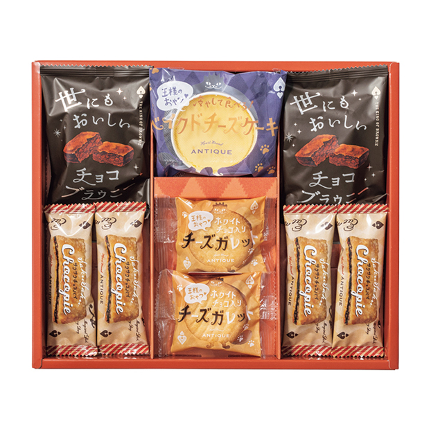| 内容量 | サクサクチョコパイ×4、ホワイトチョコ入りチーズガレット・世にもおいしいチョコブラウニー×各2、冷やして食べる!ベイクドチーズケーキ×1 |