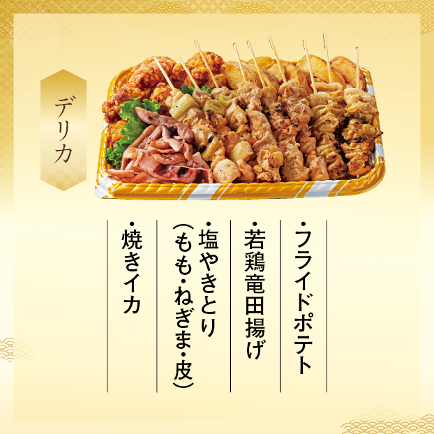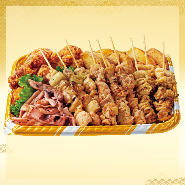 | 原材料名 | 原材料名:塩焼き鳥(ねぎま串、もも串、かわ串)、若鶏立田揚げ、フライドポテト、味付け焼きイカ、揚げ油、付け合わせ/調味料(アミノ酸等)、増粘剤(加工デンプン、増粘多糖類)、加工デンプン、リン酸塩(Na)、pH調整剤、酸味料、カラメル色素、セルロース、香料、シリコーン、(一部に小麦・卵・乳成分・いか・ごま・大豆・鶏肉・魚介類を含む) |