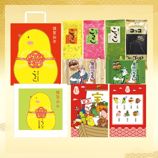 | 原材料名 | ・こっこ:砂糖、鶏卵、小麦粉、ファットスプレッド、食用油脂、乳等を主要原料とする食品、食塩/膨張剤、乳化剤、加工デンプン、香料、ソルビトール、着色料(クチナシ、カロチン)、増粘多糖類、酸化防止剤・こっこザゴールド:砂糖、鶏卵、小麦粉、ファットスプレッド、食用油脂、乳等を主要原料とする食品、食塩/膨張剤、乳化剤、加工デンプン、香料、ソルビトール、調味料(アミノ酸)、着色料(カロチン)、増粘多糖類、酸化防止剤・抹茶こっこ:砂糖、鶏卵、小麦粉、ファットスプレッド、食用油脂、乳等を主要原料とする食品、抹茶、食塩/膨張剤、乳化剤、加工デンプン、香料、ソルビトール、着色料(紅花黄、クチナシ、カロチン)、増粘多糖類、酸化防止剤・いちごこっこ:砂糖、鶏卵、小麦粉、ファットスプレッド、食用油脂、乳等を主要原料とする食品、食塩/膨張剤、乳化剤、加工デンプン、香料、ソルビトール、調味料(アミノ酸)、着色料(紅麹、カロチン)、増粘多糖類、酸化防止剤・安倍川もち:こしあん(砂糖、小豆、水飴)、水飴、もち米粉、麦芽糖、砂糖、きな粉、食塩、トレハロース・安倍川もち抹茶:抹茶あん(砂糖、インゲンマメ、ライマメ、抹茶、水飴)、水飴、もち米粉、麦芽糖、砂糖、きな粉、食塩、トレハロース |