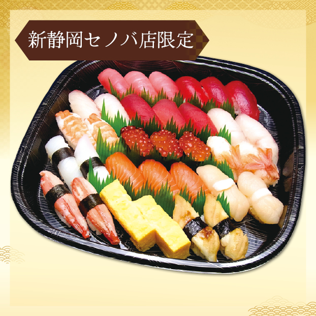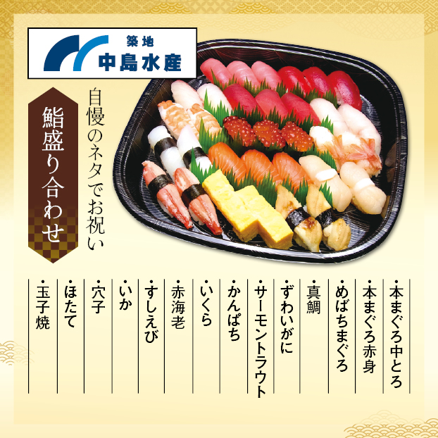 | 原材料名 | 本まぐろ中とろ、本まぐろ赤身、めばちまぐろ、真鯛、ずわいがに、サーモントラウト、かんぱち、いくら、赤えび、寿司えび、紋甲いか、穴子、ほたて、玉子焼き |