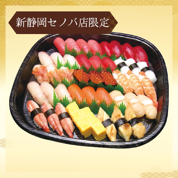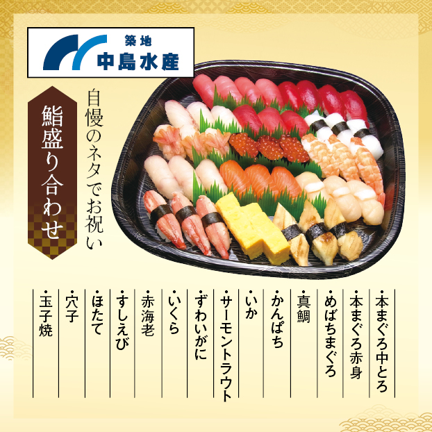 | 原材料名 | 本まぐろ中とろ、本まぐろ赤身、めばちまぐろ、真鯛、かんぱち、紋甲いか、サーモントラウト、ずわいがに、いくら、赤えび、寿司えび、ほたて、穴子、玉子焼き |