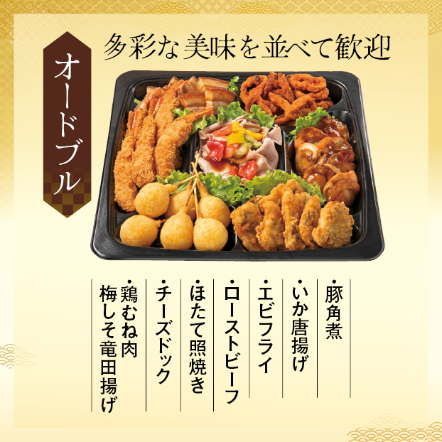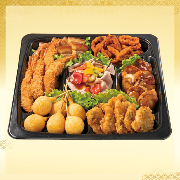 | 原材料名 | ほたて照焼、鶏むね肉梅しそ揚げ、エビフライ、豚角煮、チーズドック、イカ唐揚げ、ローストビーフ、たれ(醤油、米発酵調味料、砂糖、水飴、ぶどう糖果糖液糖、味噌、食塩、醸造酢、しょうゆもろみ、ぶどう糖、チキンエキス、香辛料、小麦発酵調味料、酵母エキス)、揚げ油、付け合せ/加工デンプン、増粘剤(加工デンプン、増粘多糖類)、pH調整剤、調味料(アミノ酸等)、カラメル色素、膨脹剤、グリシン、乳化剤、リン酸塩(Na)、酢酸(Na)、カロチノイド色素、キシロース、貝Ca、香料、シリコーン |