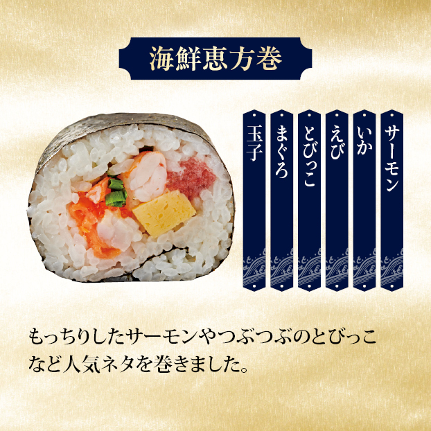 その年の年神様がいる方向、「恵方」を向いて巻き寿司を食べることで一年の幸せを願います。| 原材料名 | 酢飯(国産うるち米)、玉子焼、サーモン、いか、えび、まぐろ鉄火、とびっこ、付け合せ、海苔/加工デンプン、調味料(アミノ酸等)、pH調整剤、ソルビット、着色料(アナトー、ウコン、紅麹)、酸味料、酸化防止剤(V.C、V.E)、乳化剤、(一部にえび・小麦・卵・いか・さけ・大豆・りんごを含む) |