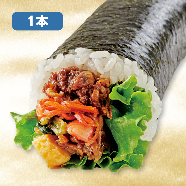その年の年神様がいる方向、「恵方」を向いて巻き寿司を食べることで一年の幸せを願います。| 原材料名 | 酢飯(国産うるち米)、味付牛肉、味付人参、玉子焼、味付小松菜、カニ風味かまぼこ、味付牛蒡、付け合せ、海苔/加工デンプン、調味料(アミノ酸等)、着色料(カラメル、紅麹、ウコン、カロチン)、pH調整剤、増粘剤(加工デンプン、増粘多糖類)、トレハロース、ソルビット、グリシン、酸化防止剤(V.C)、リン酸塩(Na)、香料、酸味料、乳化剤、(一部にかに・小麦・卵・牛肉・ごま・大豆・鶏肉を含む) |