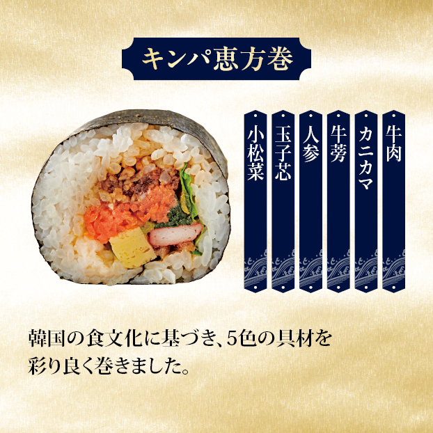 韓国の食文化に基づき、5色の具材を彩り良く巻きました。