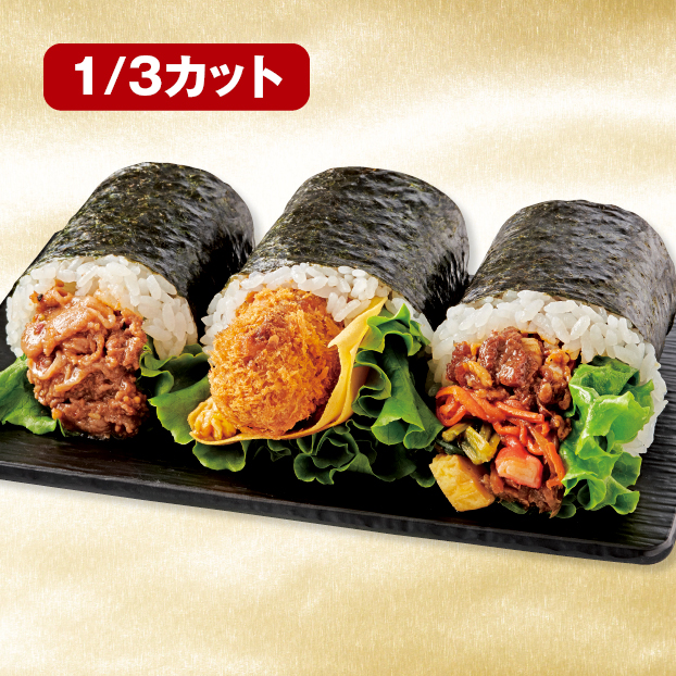 黒毛和牛すき焼き風カルビ巻、静岡県産豚肉のヒレカツ巻、キンパ恵方巻の3種類を1/3カットのセットに。お魚が苦手な方にもおすすめです。