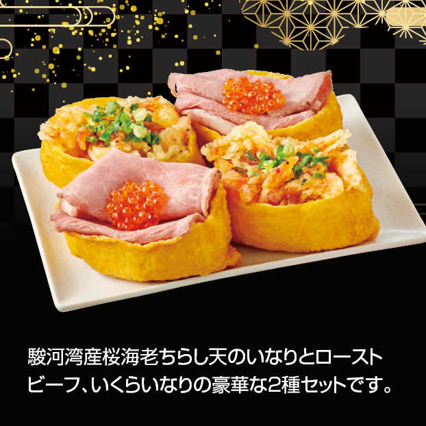 駿河湾産桜海老ちらし天のいなりとローストビーフ、いくらいなりの豪華な2種セットです。