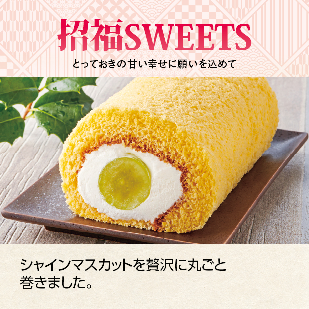 その年の年神様がいる方向、「恵方」を向いて巻き寿司を食べることで一年の幸せを願います。| 原材料名 | 原材料名 〔クリーム〕生クリーム(国内製造)、グラニュー糖、植物性油脂、〔フルーツ〕シャインマスカット 〔スポンジ〕卵、グラニュー糖、小麦粉、牛乳、食用ごま油/安定剤、バリラ香料、(一部に乳成分・卵・小麦・ごまを含む) |