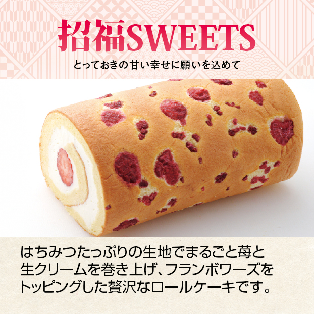 その年の年神様がいる方向、「恵方」を向いて巻き寿司を食べることで一年の幸せを願います。| 原材料名 | 卵(国産)、小麦粉、砂糖、苺、バター、フランボワーズ、乳、はちみつ、糖蜜(一部に卵、乳成分、小麦を含む) |