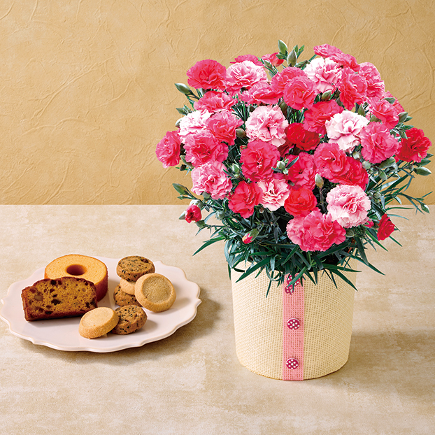 - カーネーション5号鉢、アソートBOX(黒胡麻と黒糖クッキー×3、バニラクッキー×3、バームクーヘンプレーン、ケークアングレ)